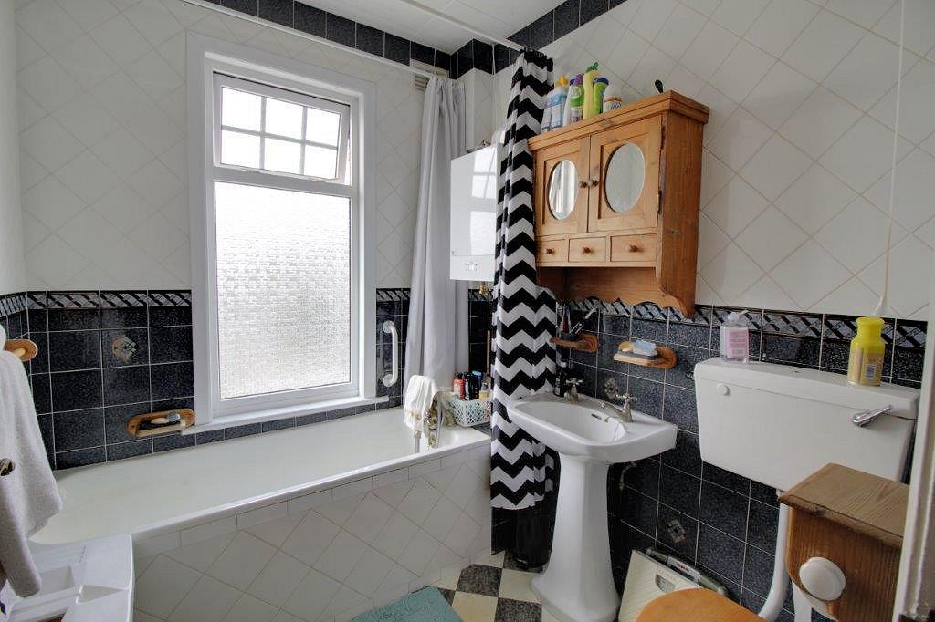 Bathroom - Tiled ceiling, tiled walls with suite comprising tile paneled bath with mixer tap over, pedestal wash hand basin, low level wc, obscure window to rear