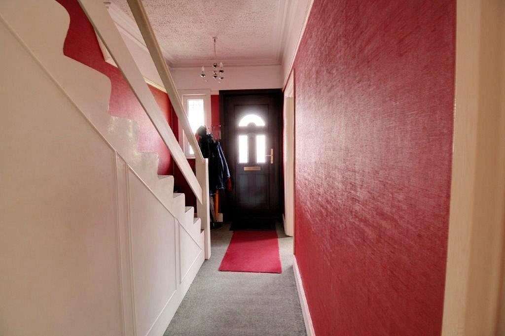 Hallway - Artex ceiling with cornice, wall mounted mains gas heater, under stairs storage cupboard