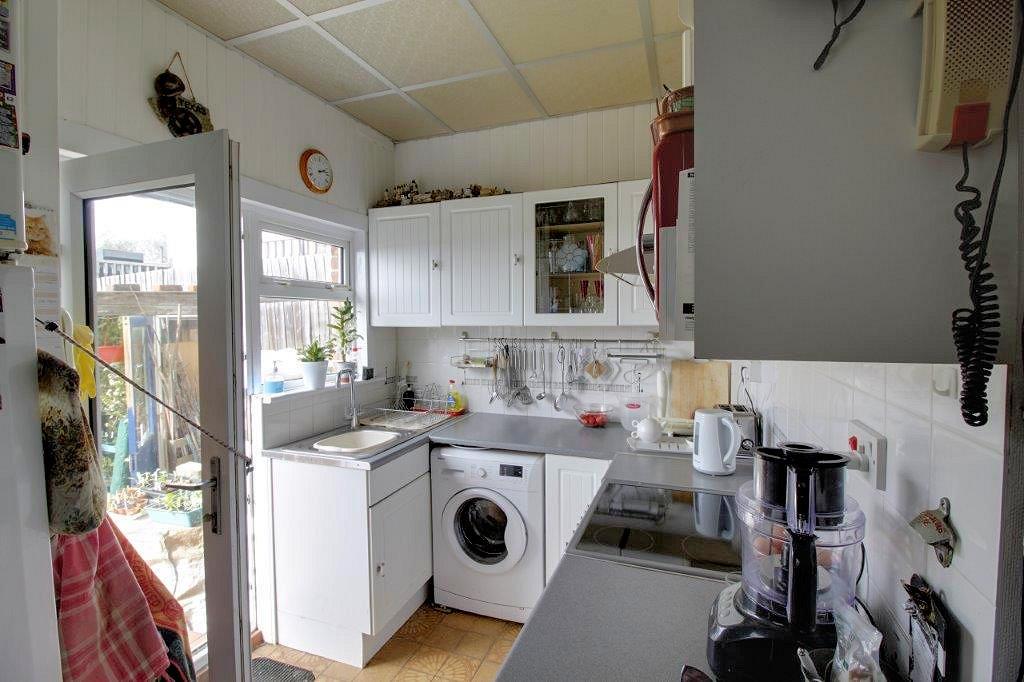 Kitchen - 7' 3'' x 7' 2'' (2.21m x 2.19m) Tiled ceiling, range of wall and base units with worktops over, space for electric cooker with extractor hood over, stainless steel single drainer sink with mixer tap, plumbing for washing machine, door and window to rear