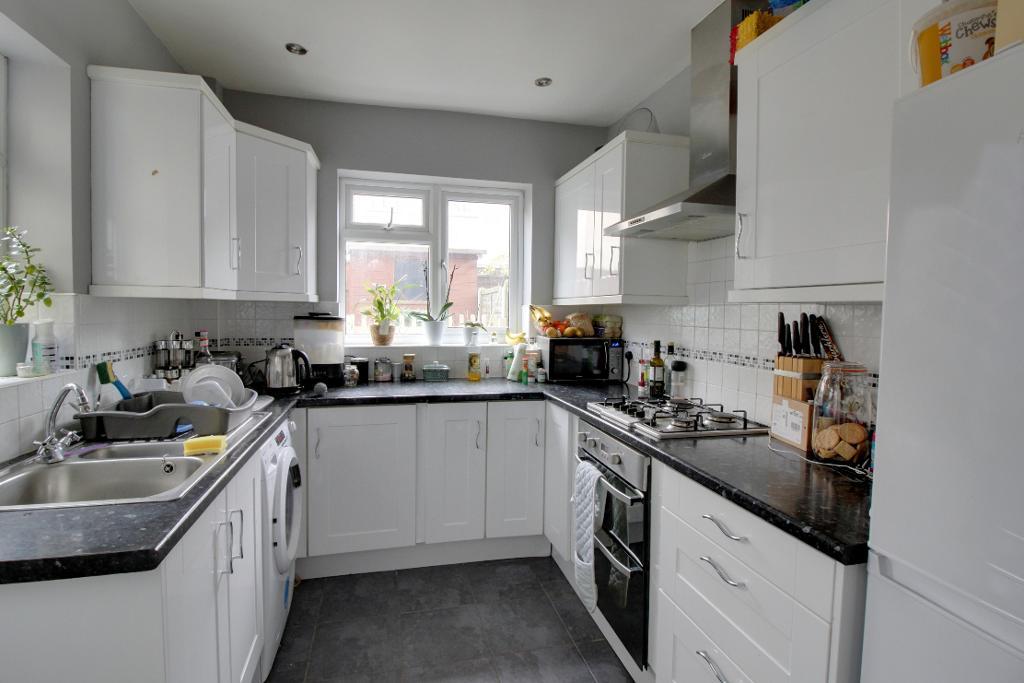 Kitchen - 10' 2'' x 7' 6'' (3.1m x 2.3m) Double glazed windows to side and rear aspects, smooth plastered ceiling with recessed lighting, wall and base level units to three aspects with rolled edge work surfaces, high gloss tiled splash backs, inset one and a half bowl stainless steel sink unit, stainless steel gas hob, extractor hob above, oven below, space and plumbing for appliances, obscure double glazed door to garden.