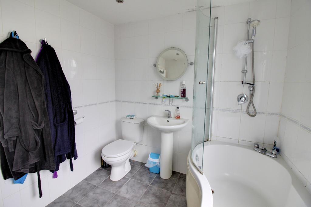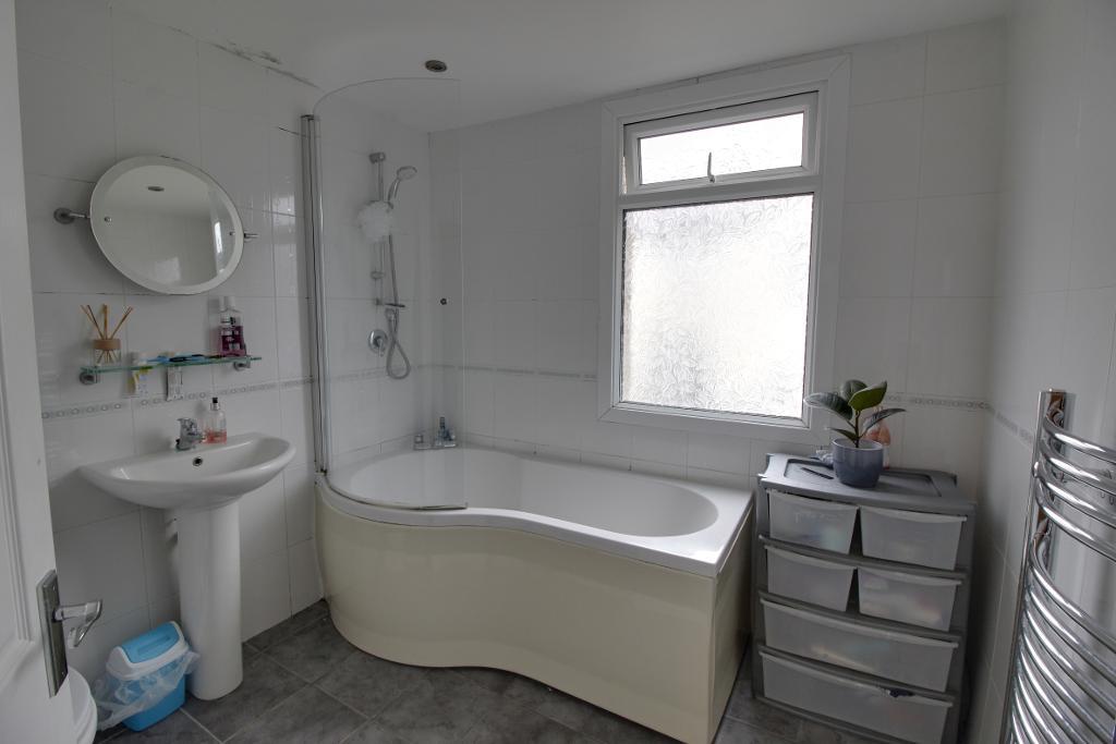 Bathroom - 7' 6'' x 7' 2'' (2.3m x 2.2m) Obscure double glazed window to rear, smooth plastered ceiling, tiling to walls, chrome towel rail radiator, white bathroom suite comprising of a P-shaped bath with fitted shower over and shower screen, pedestal hand wash basin, low level flush w/c.