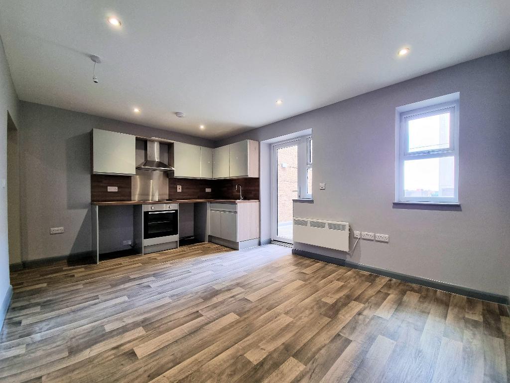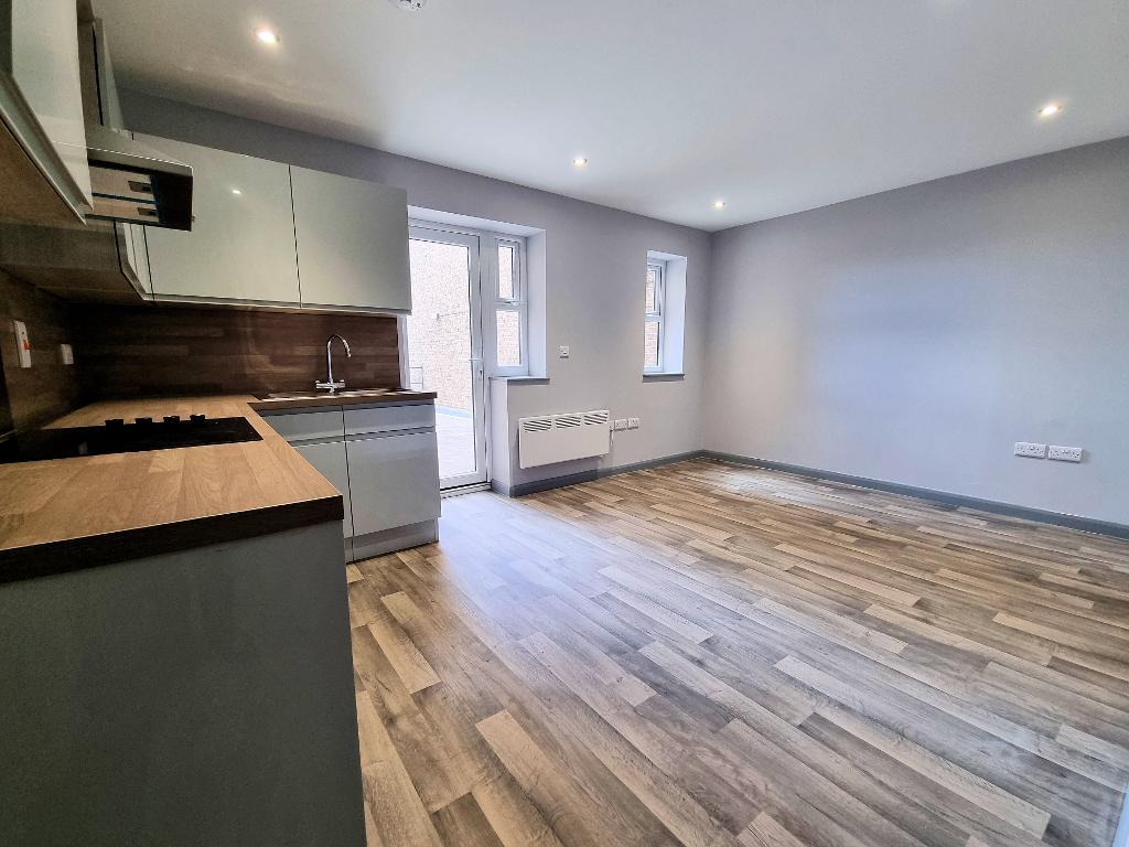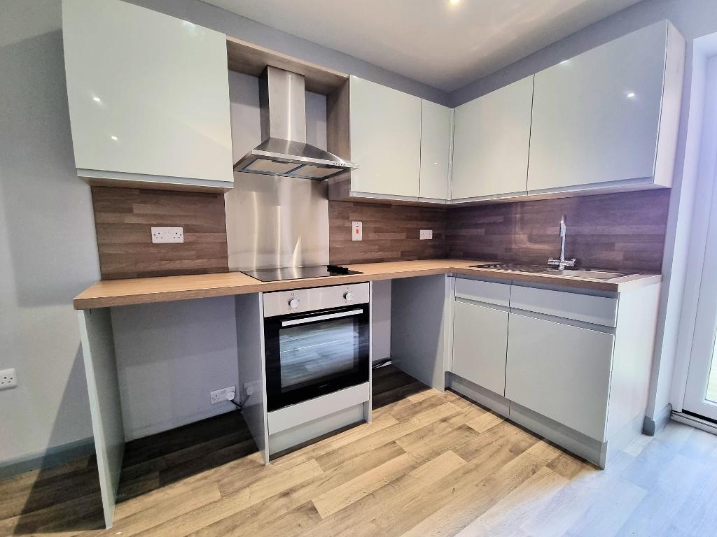 Open Plan Living Space - 15' 8'' x 10' 9'' (4.8m x 3.3m) Smooth plastered ceiling, laminate flooring, double glazed windows and door to rear leading to fire exit and roof terrace, modern kitchen comprising of base and wall mounted units, work surfaces with inset sink unit, four ring electric hob, extractor above, oven below, tiled splash backs to contrast.