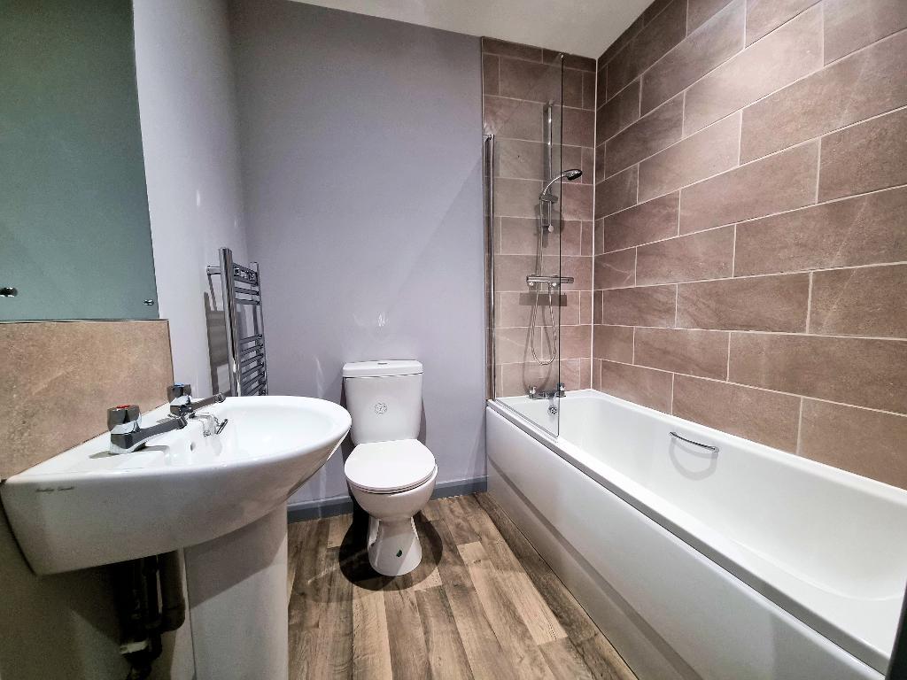 Bathroom - Modern bathroom suite comprising of a white paneled bath with mixer tap and mains fed thermostatic shower, push button flush w/c, pedestal hand wash basin, wood effect flooring, part tiled walls.