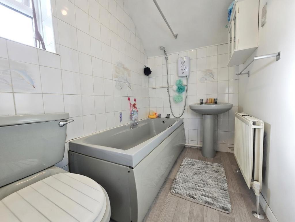 Bathroom - 7' 5'' x 4' 10'' (2.27m x 1.49m) Obscure double glazed window to side, three piece bathroom suite comprising a panelled bath with electric wall mounted shower over, low level flush w/c, pedestal hand wash basin, part tiled walls, radiator.