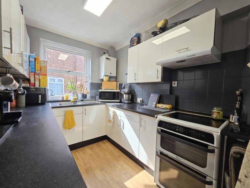 Kitchen - 10' 1'' x 7' 3'' (3.09m x 2.21m) Double glazed window to side, textured ceiling with coving, base and wall mounted unit to three aspects, work surfaces to contrast stainless steel sink unit and mixer tap, space for an electric cooker, fitted extractor over, space and plumbing for appliances, wall mounted boiler, part tiled walls, built in cupboard