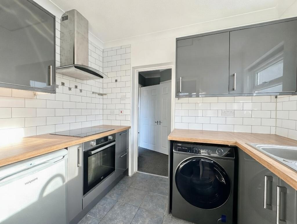 Kitchen - 8' 9'' x 6' 0'' (2.69m x 1.84m) Double glazed window to side, smooth plastered ceiling with coving, high gloss kitchen units to three aspects, work tops with inset stainless steel sink unit and drainer, integral electric oven and electric hob above with an extractor canopy and courtesy light. Part tiled walls and tiled flooring to contrast, space and plumbing for appliances.