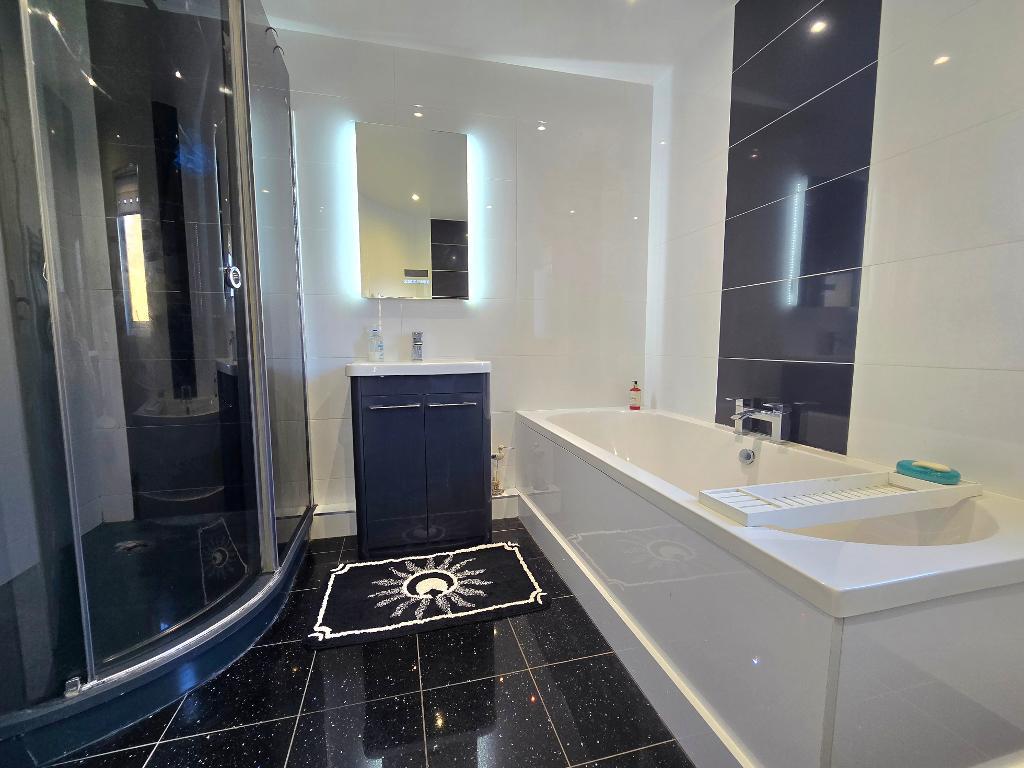 Bathroom - 9' 6'' x 8' 11'' (2.9m x 2.74m) Obscure double glazed window to the rear, smooth plastered ceiling with spot lights, extractor fan. Modern four piece bathroom suite comprising a panelled bath with taps to the centre, vanity hand wash basin, push button flush w/c, enclosed shower cubicle, high gloss tiled flooring, tiled walls, chrome plate heated towel rail.