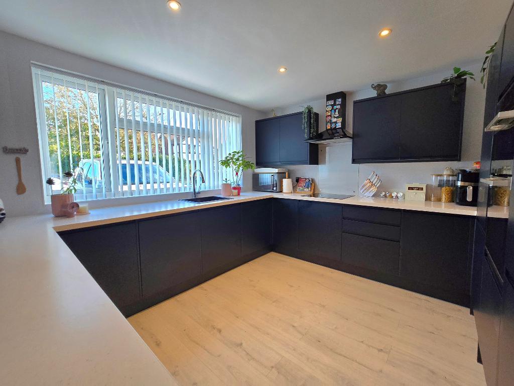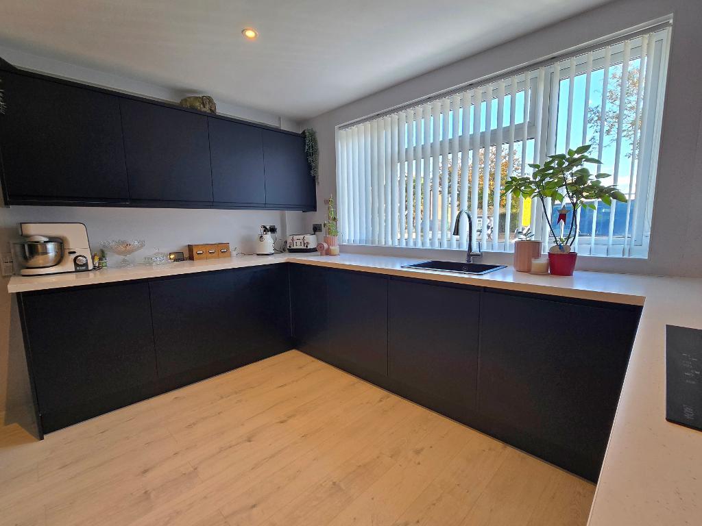 Kitchen - 12' 0'' x 11' 1'' (3.67m x 3.4m) Large double glazed windows to the front, smooth plastered ceiling with spot lights, laminate flooring. Howdens fitted kitchen with Marble effect worktops to three aspects, base and wall mounted units, electric hob with extractor above, a range of fitted "Lamona" appliances which include and oven and grill, washing machine, tumble dryer, dishwasher plus large fridge and freezer.
