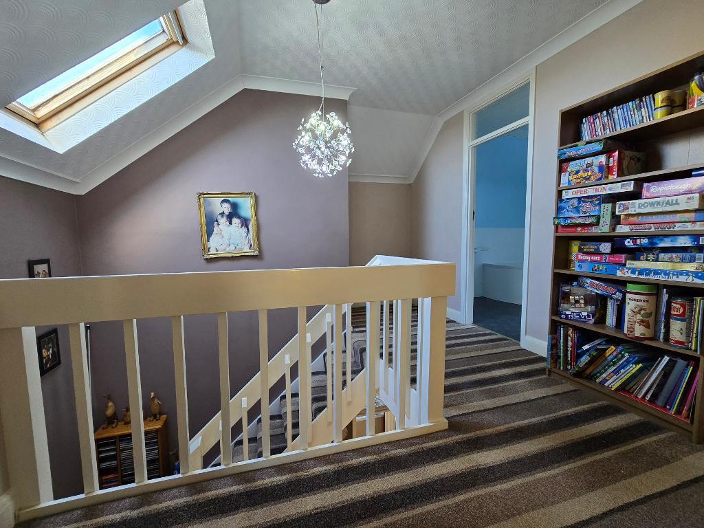 First Floor Landing - Large first floor landing, Velux window to side, textured ceiling with coving, a range of fitted cupboards, access to large Eaves storage, doors to