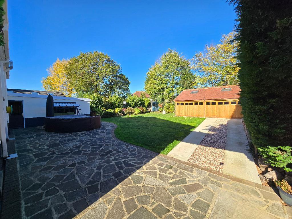 The home features a well-appointed kitchen, complemented by a separate utility room for added convenience, while two modern bathrooms ensure there is plenty of comfort for a busy household. The expansive layout continues outdoors, where there is substantial parking, along with a double-length garage and a second large detached garage perfect for car enthusiasts or those requiring additional storage or workshop space.