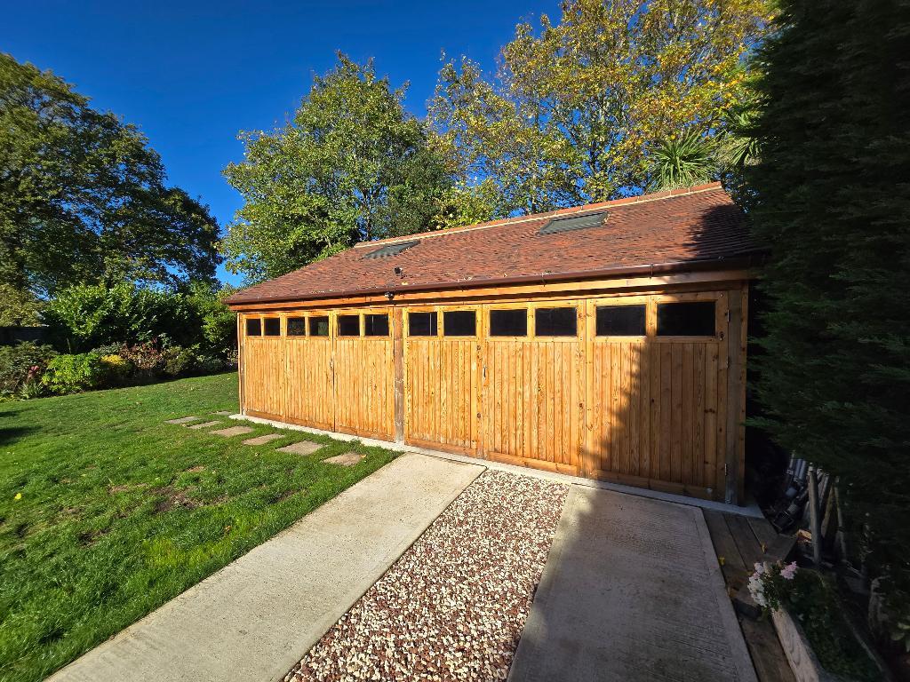 Detached Garage - 29' 10'' x 21' 9'' (9.11m x 6.63m) Large timber framed double garage with power and lighting, loft storage, two by-fold doors, velux windows.