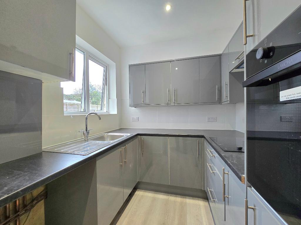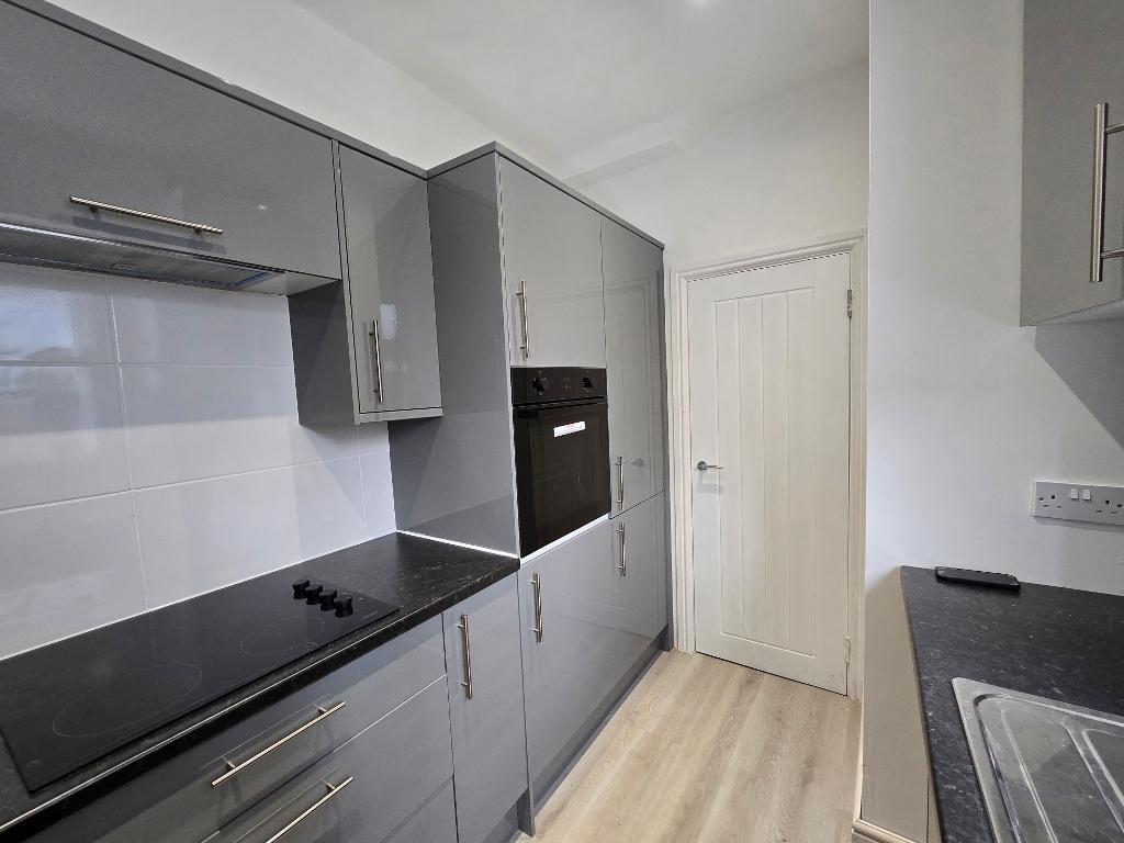 Kitchen - 10' 0'' x 7' 1'' (3.05m x 2.16m) Double glazed window to side, smooth plastered ceiling, laminate flooring, high gloss base and wall mounted units to three aspects, space and plumbing for appliances, integral oven, four ring electric hob inset to rolled edge work surface, extractor fan, concealed combination boiler.