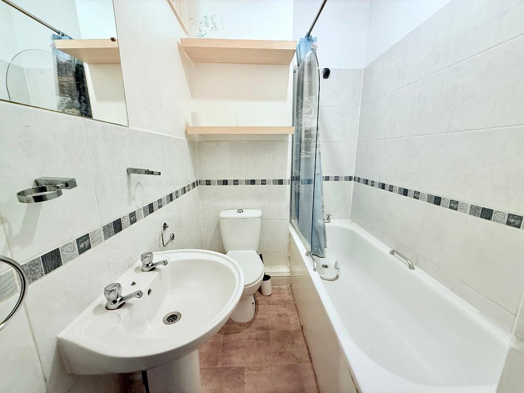 Bathroom - 6' 4'' x 5' 1'' (1.94m x 1.55m) Borrowed light windows, white bathroom suite comprising of a panelled bath with a shower screen, push button flush w/c, pedestal hand wash basin, part tiled walls, radiator.