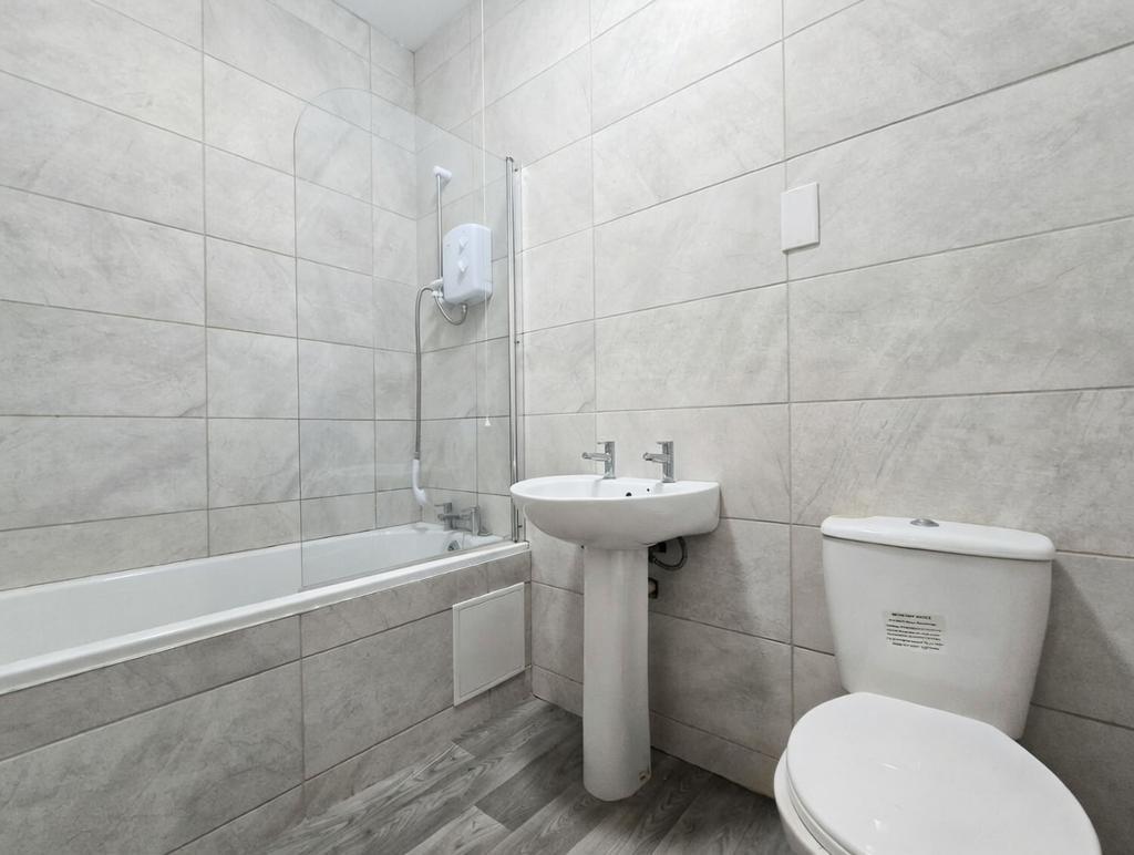 Bathroom - 6' 10'' x 5' 6'' (2.1m x 1.7m) Smooth plastered ceiling, extractor fan, tiled wall, vinyl flooring, tile panelled bath with service point, mixer tap, wall mounted electric shower, pedestal hand wash basin, push button flush WC.